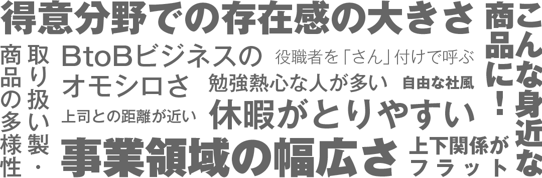 皆さんが聞いたことのある名前の通った会社ではありませんが、若い人が活躍できる風土を持つ、とてもいい会社です。身近な生活に密着した製品を一緒に創っていきましょう。